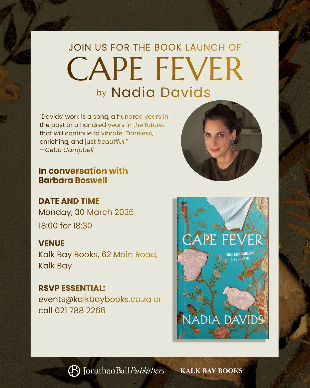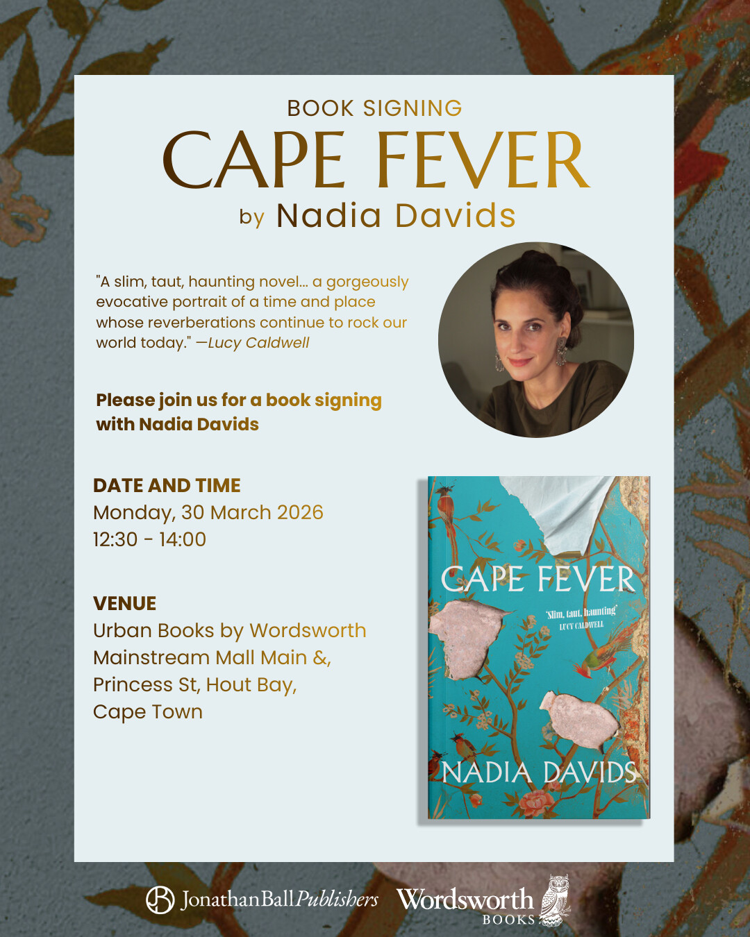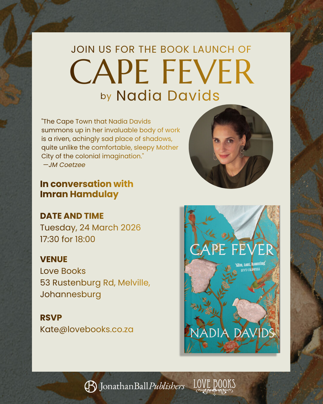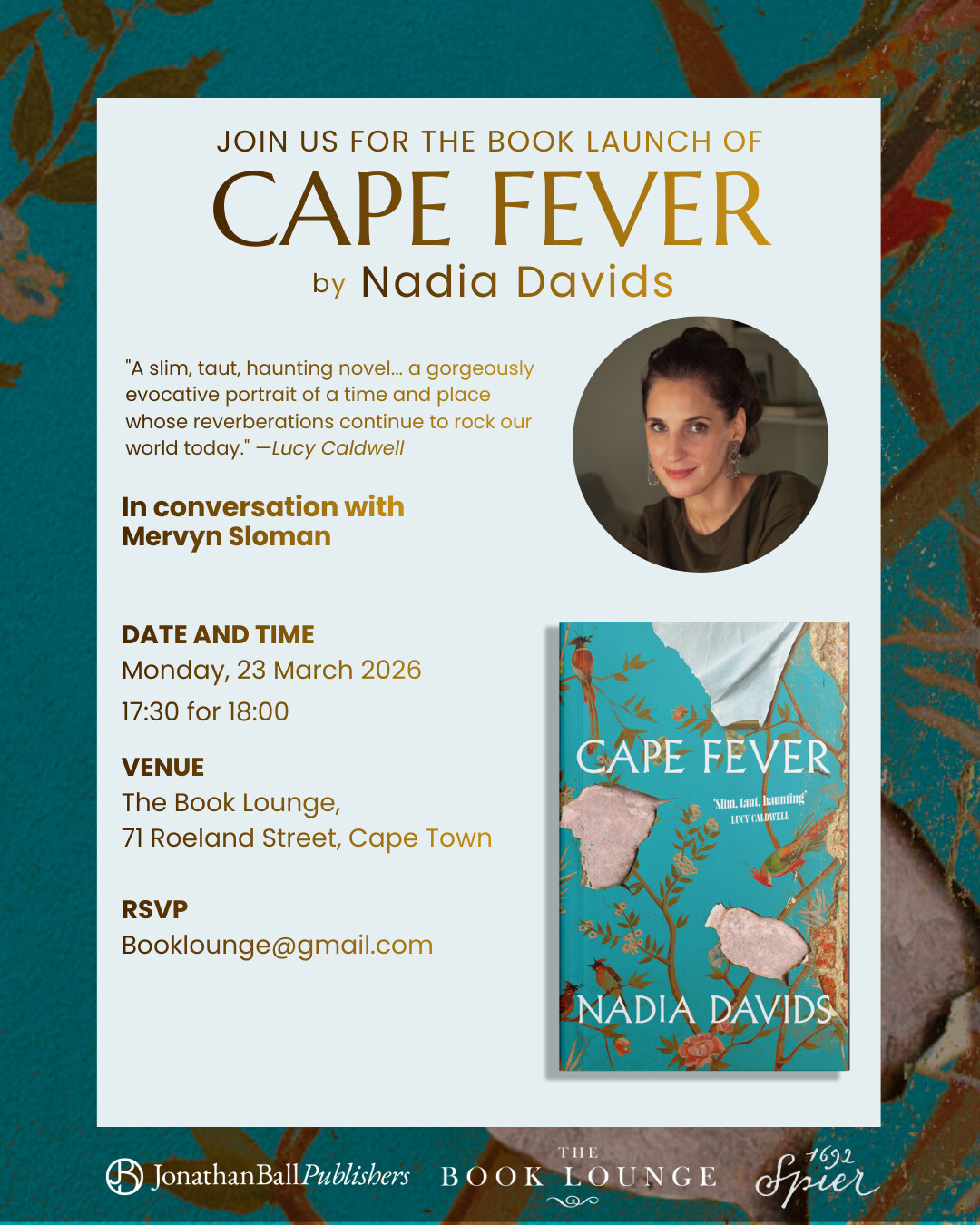 Written by Nadia Davids, the South African playwright and novelist, who is on a book tour in Joburg and Cape Town. If there is an event near you, I highly recommend taking the chance to hear from her in person and grab a copy of Cape Fever.