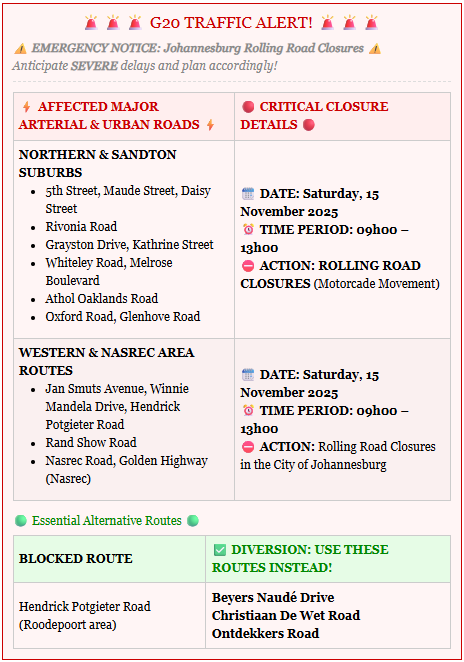 National routes, including the N1, M1, and N12, will be subject to closures, lane restrictions and intermittent disruptions during summit.